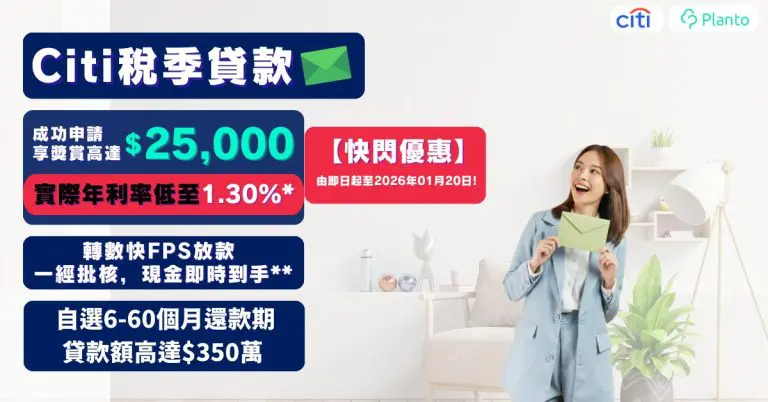 Citi稅季貸款限時快閃優惠登場! 交稅在即,Citi稅季貸款月平息低至0.063%(1.30% 以包括HK$2,000現金回贈或1.40% 以不包括任何現金回贈)*,最快可即日批核及收取現金^,而且是零手續費兼無隱藏收費,成功申請最多可賺HK$25,000獎賞#(記得填妥「Planto獎賞換領表格」,先可賺足獎賞!)