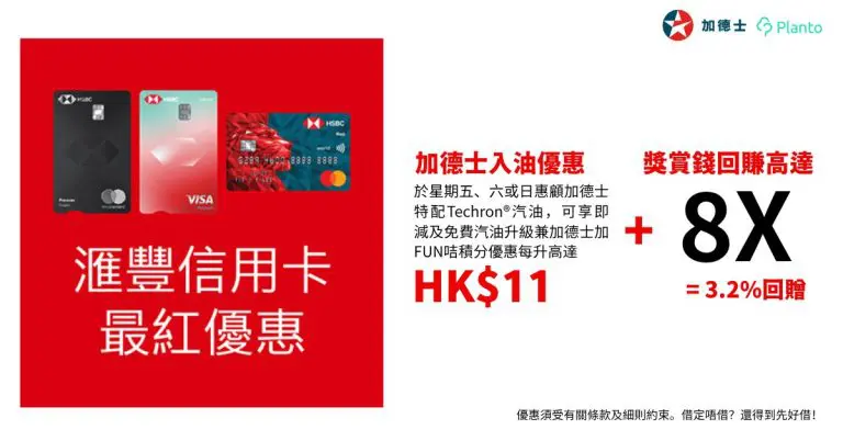 - 享用優惠方法:逢星期五、六或日,使用合資格實體滙豐信用卡於加德士加油站入加德士特配Techron®汽油